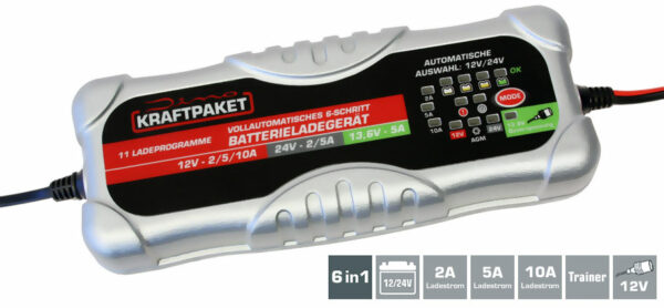 Das Dino Kraftpakete 12V/24V Batterieladegerät ist ein vollautomatisches, mikroprozessorgesteuertes Ladegerät für alle gängigen Blei-Säure-Batterien. Mit 6-Schritt-Ladeprogramm, wählbaren Strömen und Dauerspannungsausgang ist es optimal für den sicheren und schonenden Einsatz an 12V- und 24V-Batterien.