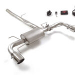 Hochwertige Edelstahlauspuffanlage für den Audi A3 Sportback 35 TFSI. Ausgestattet mit 2×90 mm runden Carbon-Endrohren (Shot, versetzt) für aggressiven Sound und sportliches Design. Die veredelten Carbon-Endrohre setzen optische Akzente am Heck.
