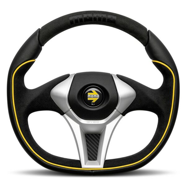 • Dezente MOMO-Stickerei in Schwarz bei 12 Uhr für einen eleganten Rennsport-Look